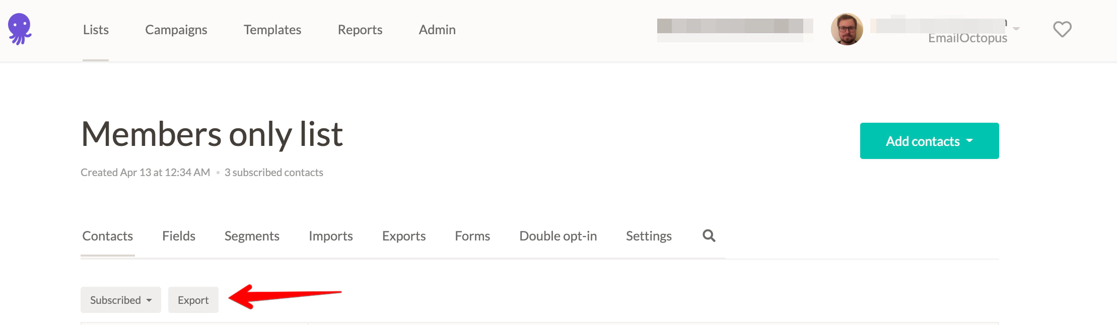 In your EmailOctopus account, navigate to the list of emails you’d like to import to Ghost members. Once you’re done, click Export.